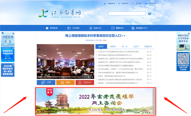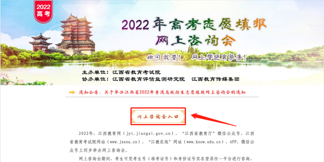 登录江西省教育考试院网站,点击图片“2022年高考志愿填报网上咨询会”,进入网上咨询会页面。