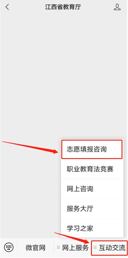 进入“江西省教育厅”微信公众号,点击“互动交流”→“志愿填报咨询”,进入高考志愿网上咨询考生登录页面。