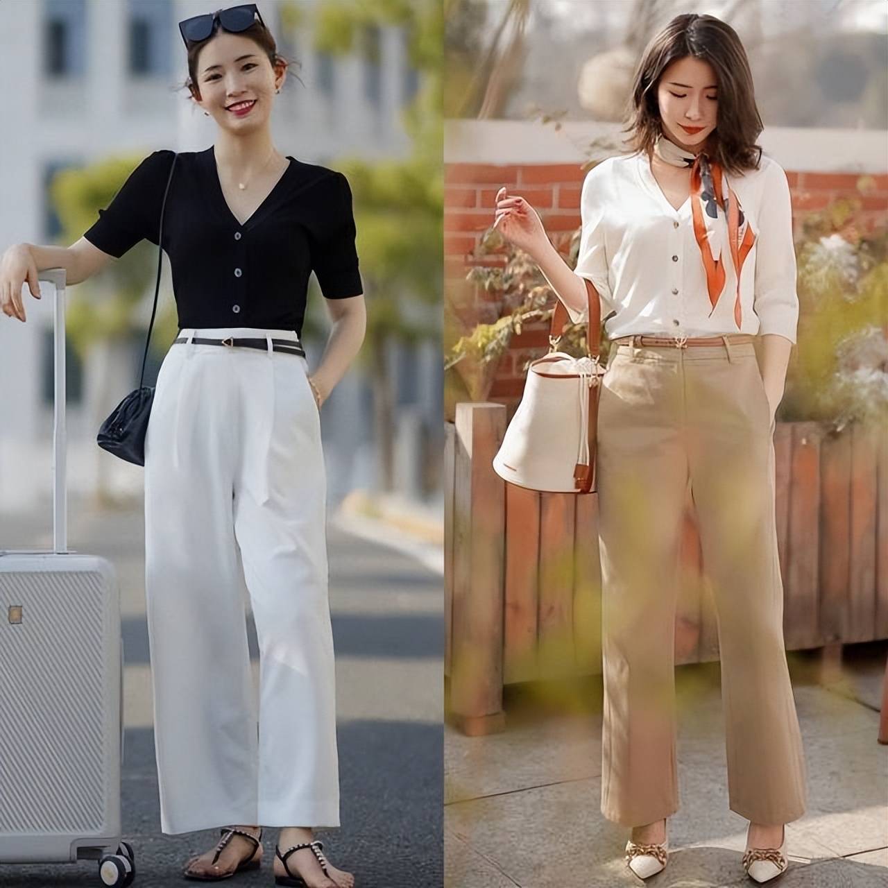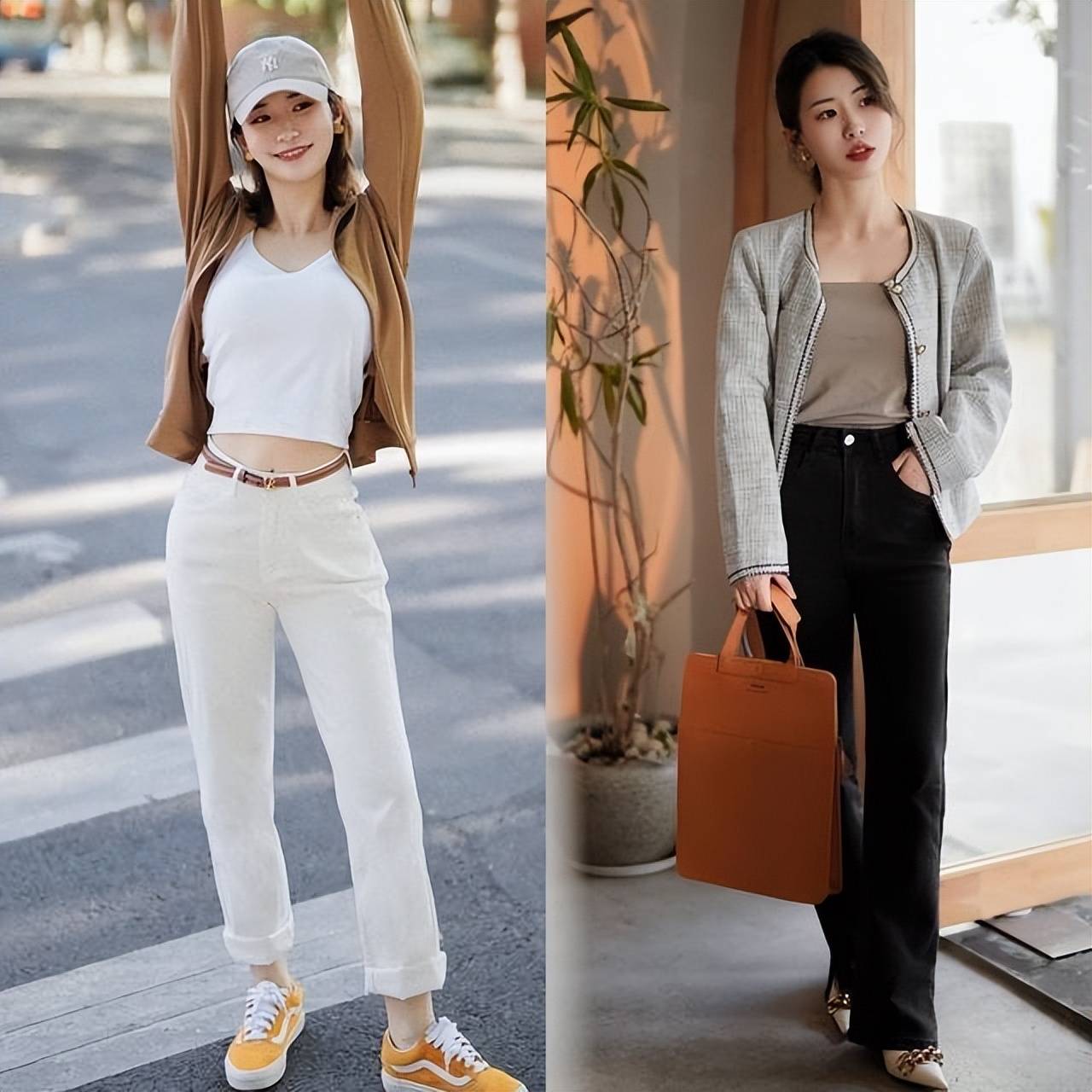 除了在色彩搭配上要懂得收敛性之外,在款式的搭配上也需要使用更多的短款款上衣和高腰裤装的搭配方式来彰显出非常经典的一短一高的搭配效果,因为短款的小上衣可以穿出缩短上衣比例的效果,下半身搭配高腰款式的长裤则可以延长下半身的比例,让身材比例看上去更加优越。