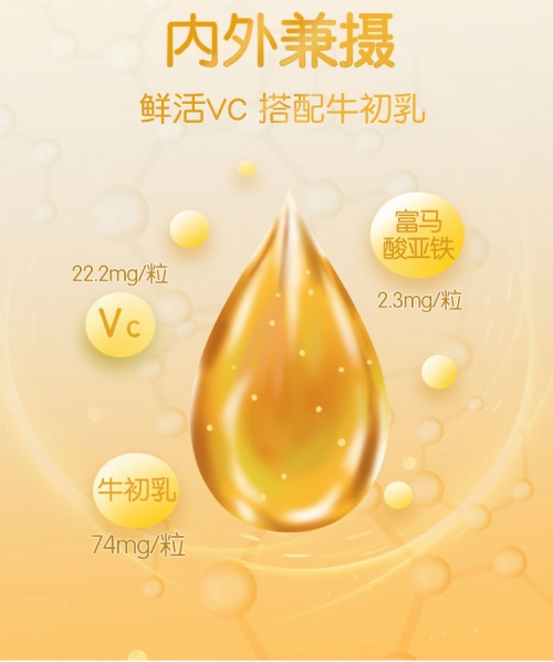除牛初乳外,添加重要的维生素C,促进钙、铁、叶酸的吸收,吸收更加充分。由于人体无法生成维C,且维C是水溶性维生素,溶于水,会通过尿液、汗液排除体外,及时适量补充是重要环节,进而增强人体抵抗力。此外还有成分富马酸亚铁,参与机体供氧运输,增加中性粒细胞和吞噬细胞的功能。
