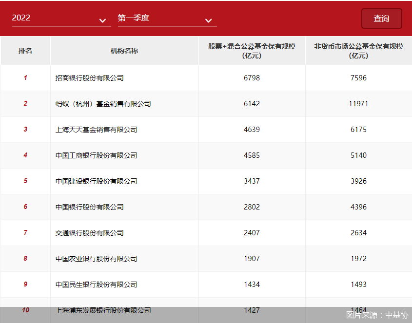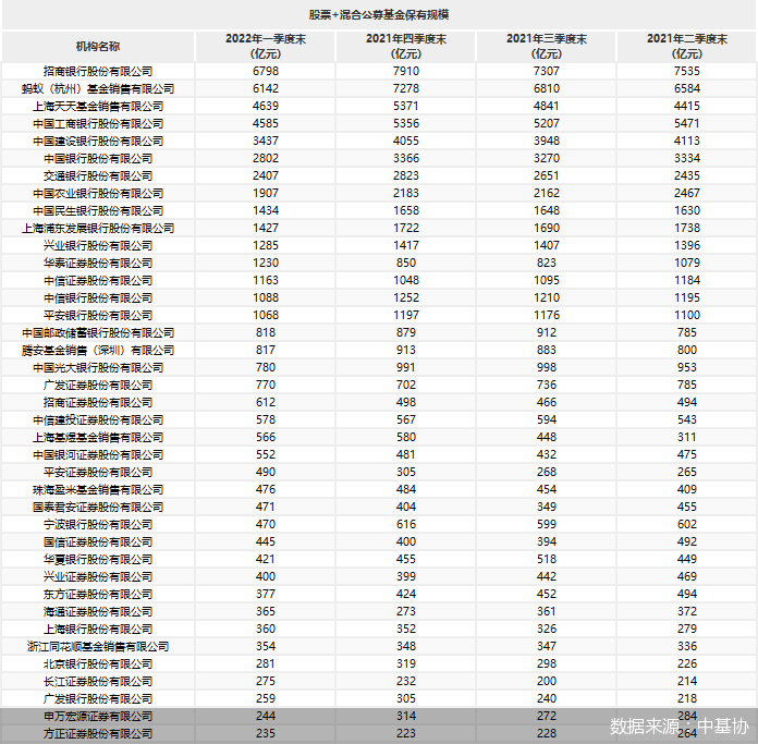 而从最近4个季度末的股票基金和混合基金保有规模前十名来看,虽然排名偶有轮动,但基本被招商银行、蚂蚁基金、天天基金、工商银行(601398)、建设银行(601939)、中国银行(601988)、交通银行(601328)、农业银行(601288)、民生银行(600016)、浦发银行(600000)包揽。