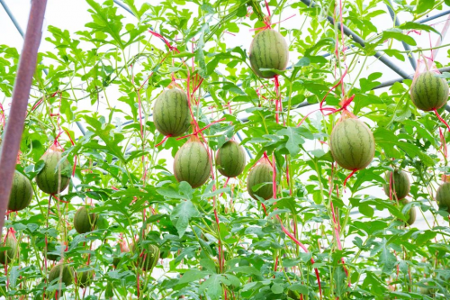 进入西瓜种植棚,便可以看到藤蔓顶部纵横交错的架子上生长着一个个圆滚滚的西瓜。彩虹西瓜不仅在种植方式上新奇,对种植的要求也非常严格,需要在符合NY/T5010无公害土地检测的砂质土壤中种植,同时还要充沛的阳光、土壤湿度和昼夜温差的精准控制。经过各个环节的细心培育,并坚持一藤一蔓只养一瓜的匠心培养,才培育出高品质的彩虹西瓜。