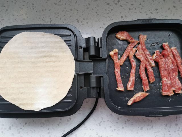 5、电饼铛预热,可以拆卸的一面倒入少许食用油,用来煎牛排,另一面用来烙饼皮,一面烙2分钟,翻面再烙1分钟就可以了。