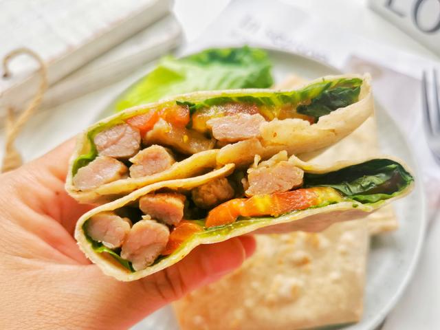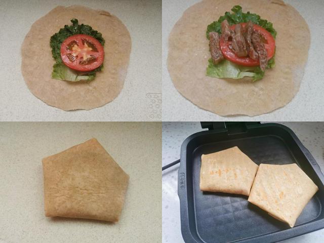 6、烙好的饼皮一定要注意保湿,摞在一起,用纱布盖上。取一个饼皮,放上几片生菜,放上一片番茄,放上煎好的牛排,喜欢什么口味的酱汁也可以挤上一些,将饼皮折叠成五角的形状,放入电饼铛继续烙两分钟定型就可以了。。