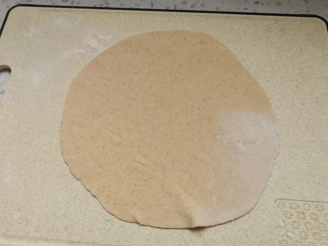 3、案板上撒上一些干面粉,取一个面剂子擀成圆形薄片,尽量擀薄一些。