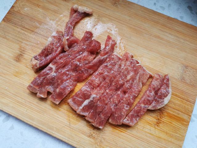 4、牛排切成长条,我用的大希地西冷牛排,腌制好的牛排直接用。