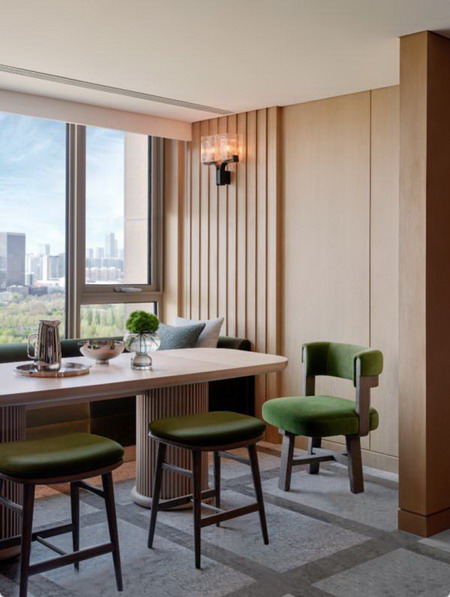 早餐区的座椅延续了茶吧所使用的墨绿色,视野也是这里的一大亮点,在阳光大好的清晨望向窗外,可以清晰看到望京商务区。