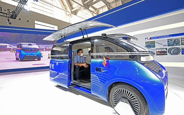 6月24日,在第六届世界智能大会天津制造业立市展上,参会嘉宾体验“天津号”纯太阳能(000591)汽车。新华社记者 赵子硕 摄