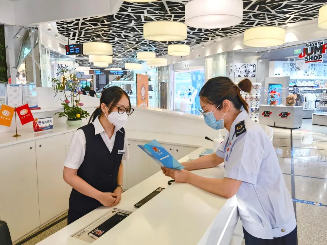 图为上海市徐汇区税务干部实地走访复工营业的大型商业综合体,送上惠企纾困税收政策。魏玥/摄