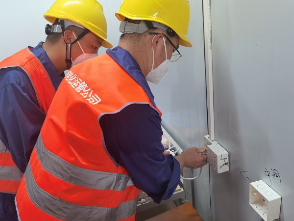 14日16时许,12名援建人员到达儋州方舱医院开始工作,他们的任务是舱内的电缆敷设及电源插座的排查调试。闷热的环境下,他们穿着厚重的工作服戴着防疫口罩争分夺秒赶工,汗水浸湿衣服也不自知。14日14时至15日凌晨2时许,在连续工作10个小时后,他们才躺在地上,靠在线盘上进行了4个小时的休整。10个小时他们完成了四号舱4层AB区512个插座的测量排查和问题插座的修理更换,敷设了150平方5芯电缆0.5公里,为二号仓一层配电箱制作低压电缆头12个。