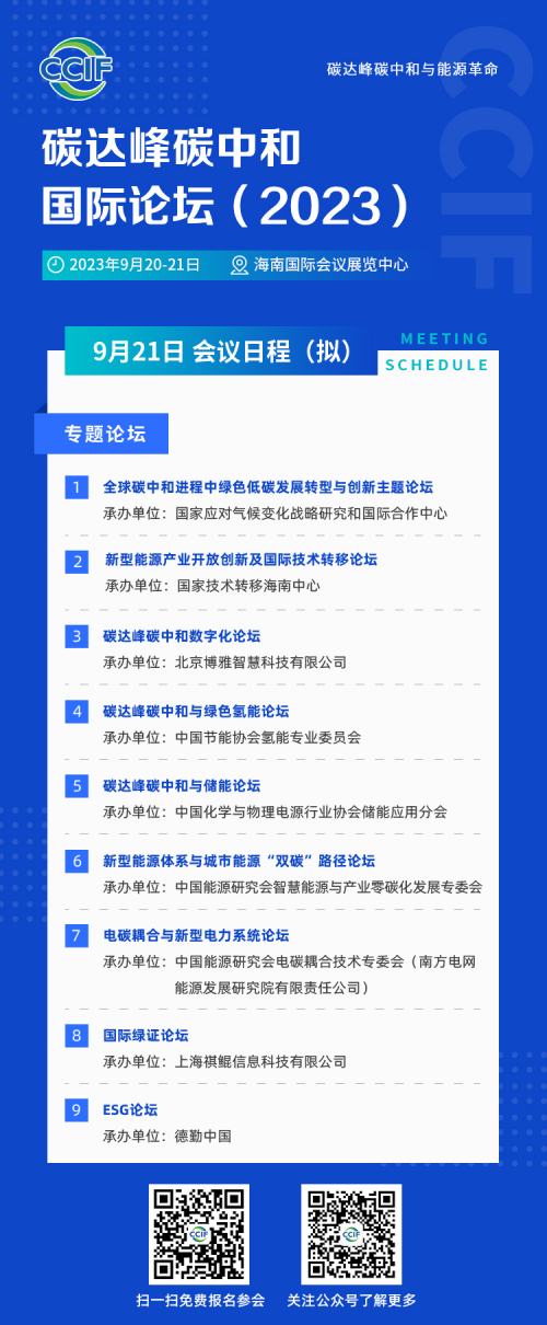 党的二十大报告明确提出,实现碳达峰碳中和是一场广泛而深刻的经济社会系统性变革。这一科学论断蕴含了中国式现代化的独特生态观,把我国的碳达峰碳中和战略提升到了全局层面,成为习近平生态文明思想的重要组成部分。为宣传习近平生态文明思想和党的二十大精神,构筑碳达峰碳中和全球性合作平台,由中国能源研究会主办,中国能源研究会碳中和专业委员会、中国环境科学学会碳达峰碳中和专业委员会、中国科协新技术开发中心有限责任公司、海南省经济研究中心、江苏现代低碳技术研究院、世信朗普国际展览(北京)有限公司承办的碳达峰碳中和国际论坛(2023)将于2023年9月20-21日在海南国际会议展览中心举办。