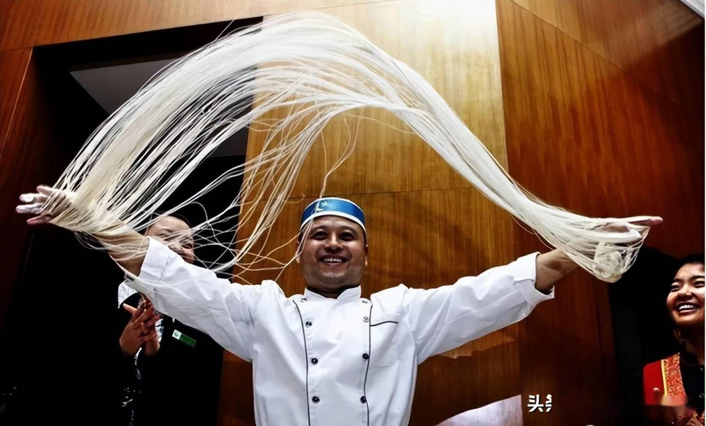 摔面条,摔面的操作程序和质量很讲究,用力摔30响,齐拉面条128根,长度达到7.5尺后下锅三滚后,捞入凉开水一过即可食用,口感柔韧滑腻,风味别致。