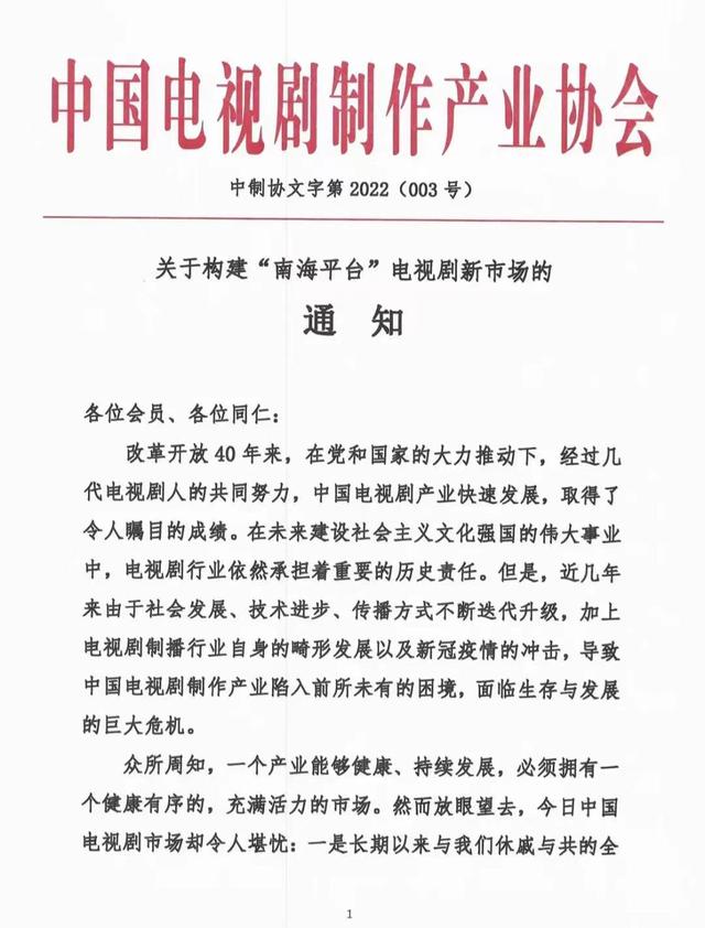中国电视剧制作产业协会日前发布《关于构建“南海平台”电视剧新市场的通知》(以下简称《通知》),号召剧集行业合力打造“南海平台”,构建中国电视剧(网络剧)新市场。